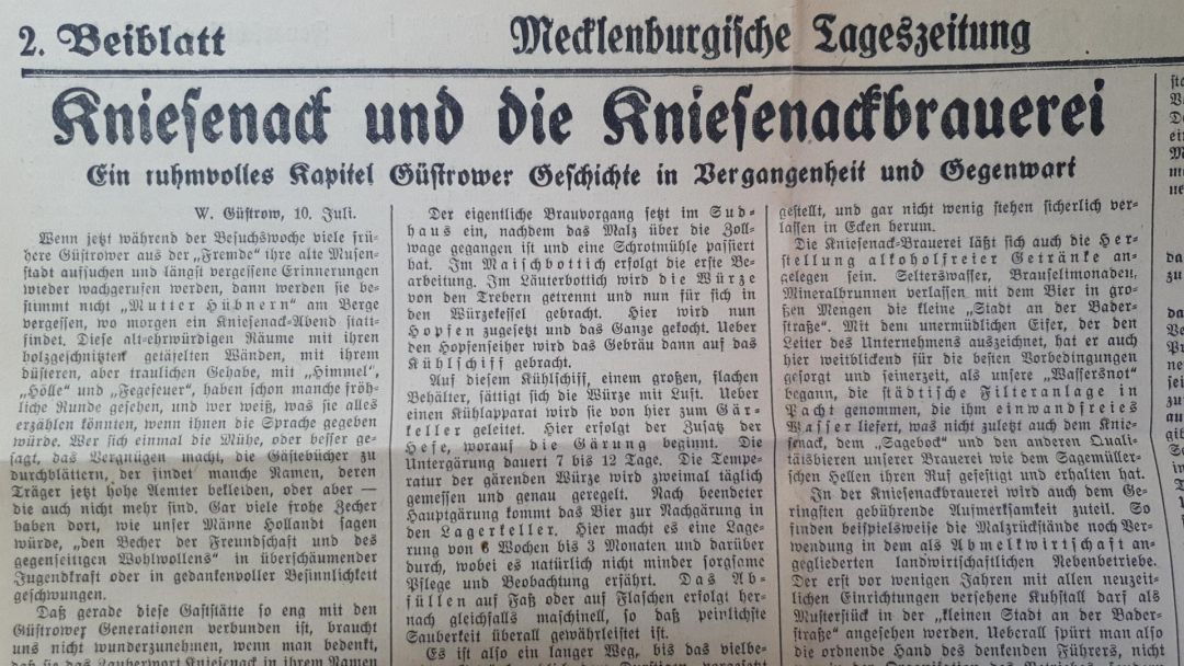 Auf diesem Kühlschiff, einem großen flachen Behälter, sättigt sich die Würze mit der Luft. Über einen Kühlapparat wird sie von hier zum Gärkeller geleitet. Hier erfolgt der Zusatz der Hefe, worauf die Gärung beginnt. Die Untergärung dauert 7 bis 12 Tage. Die Temperatur der gärenden Würze wird zweimal am Tag gemessen und genau geregelt. Nach beendeter Hauptgärung kommt das Bier zu Nachgärung in den Lagerkeller. Hier macht es eine Lagerung 6 Wochen bis 3 Monaten und darüber durch, wobei es natürlich nicht minder sorgsame Pflege und Beobachtung erfährt. Das Abfüllen auf Faß oder Flaschen erfolgt hernach gleichfalls maschinell, so dass peinlichste Sauberkeit über gewährleistet ist. Kniesenack und Kniesenackbrauerei.“ (vgl. Mecklenburgische Tageszeitung Nr. 158, 11.7.1933, 2. Beiblatt