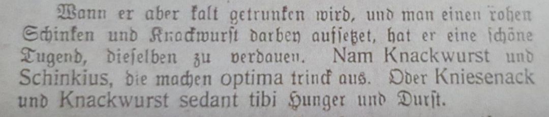 Hier kann man lesen, dass da Bier als „Aphrodisiacum“ bezeichnet wird und es wird empfohlen, „daß man dasselbe nur modice (angemessen) trinken [soll], und nicht wie den groben Kujonen (Schurken) und die Bauernschlüfflern.“ Wenn man es langsam und in kleinen Schlucken trinkt, so ist man innerhalb kurzer Zeit „reich im Gedanken, beherzt, lustig, holdselig, mit liberalischen Geberden und mild in Verheißungen, sonderlich gegen die Frauen und Jungfrauen.“ Wenn man es hingegen schnell trinkt und nicht genießt, so macht das Bier „aus Menschen Säue“.